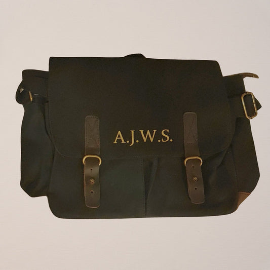 Stylish Black Waxed Canvas Messenger Bag - Elegant School or Work Bag - Brass Hardware - Customisable Initials