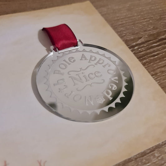 Nice List Medals with Personalised Note From Santa - Silver Mirror Acrylic Medal on Christmas Coloured Ribbon for Kids & Believers