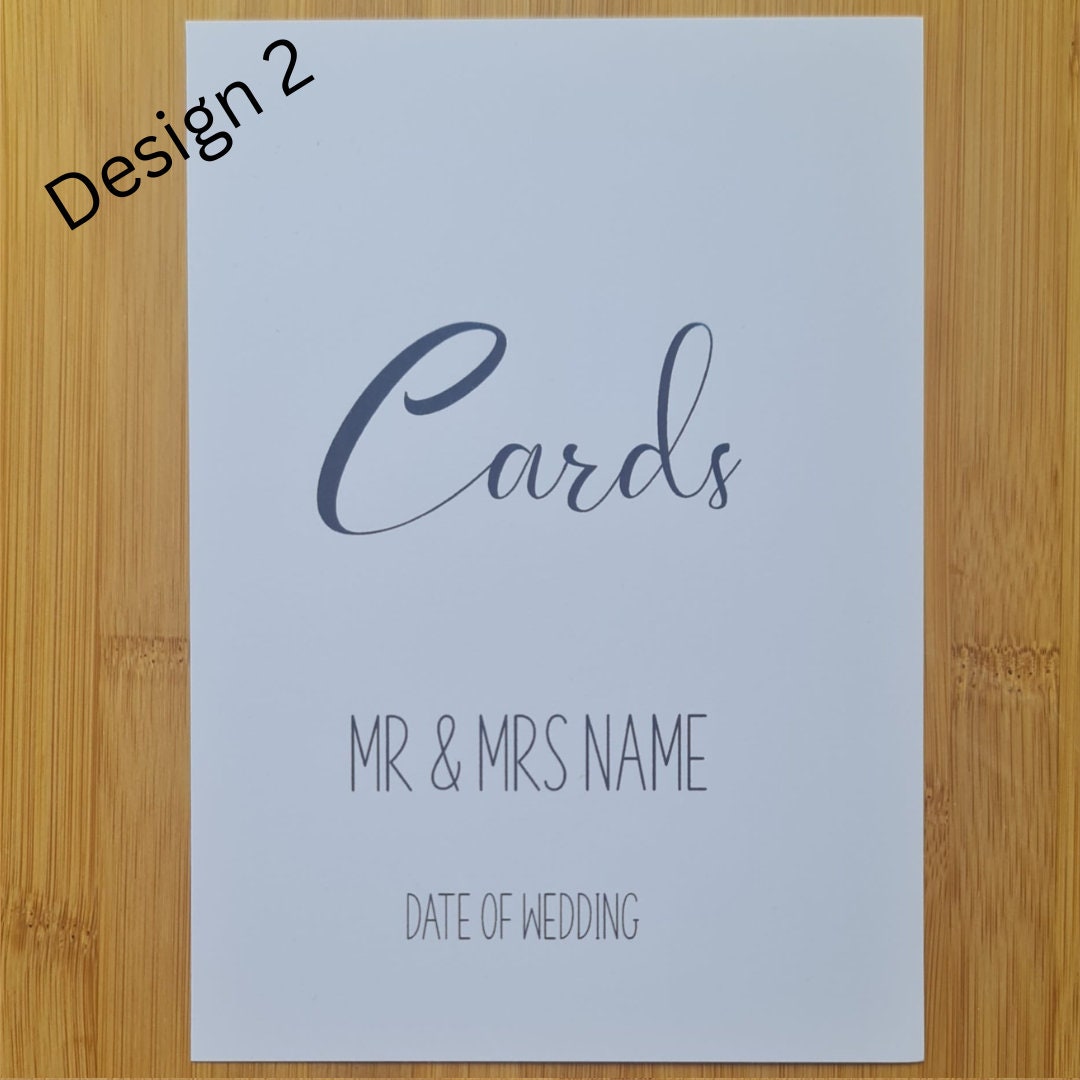 This beautiful wedding cards sign is a perfect way to direct your guests to celebrate your special day and keep your cards / gifts organised all in one place. The sign is printed on high-quality cardstock so you can easily display it at your wedding in a frame or on a stand. The sign features a modern design with the word "Cards". You can also personalise the sign with the names of the newlyweds and the date of their wedding. This sign is sure to be a cherished keepsake for the happy couple. It's a wonderful way to commemorate their special day and celebrate the beginning of their new life together. Available in a range of sizes including A4, A5, A6 and A7. Please get in touch before ordering if you would like a size not currently available and I'll see if I can do it for you. We can also do other card colours but again, please get in touch before ordering. Please note no frames or stands are included. You are buying the printed sign only.